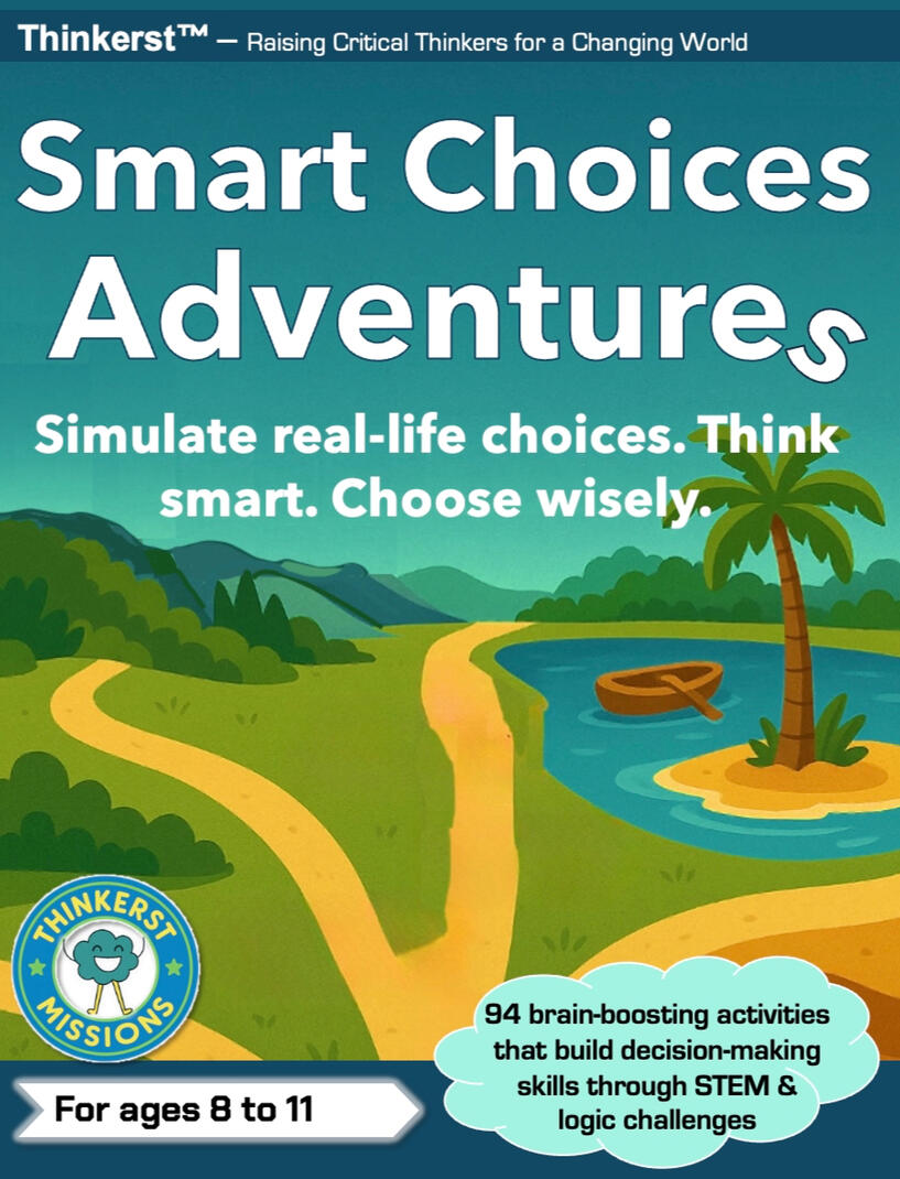 We live in an age of information overload, yet many young minds are left unchallenged. Instead of learning to think critically, kids are passively consuming content.Thinkerst™ was created to change that by equipping elementary school students with real thinking tools for a fast-changing world shaped by AI and innovation.Our programs use story-based simulations to immerse kids in real-life decision-making. For example, in Smart Choices Adventures, students navigate everyday dilemmas, weighing short- vs. long-term consequences. In Money Quest Adventures, they learn financial literacy by running an eco-business and making smart money choices.Every challenge blends logic, math, reading, and ethical thinking into one meaningful journey.Through these workbooks and live enrichment classes, kids build: