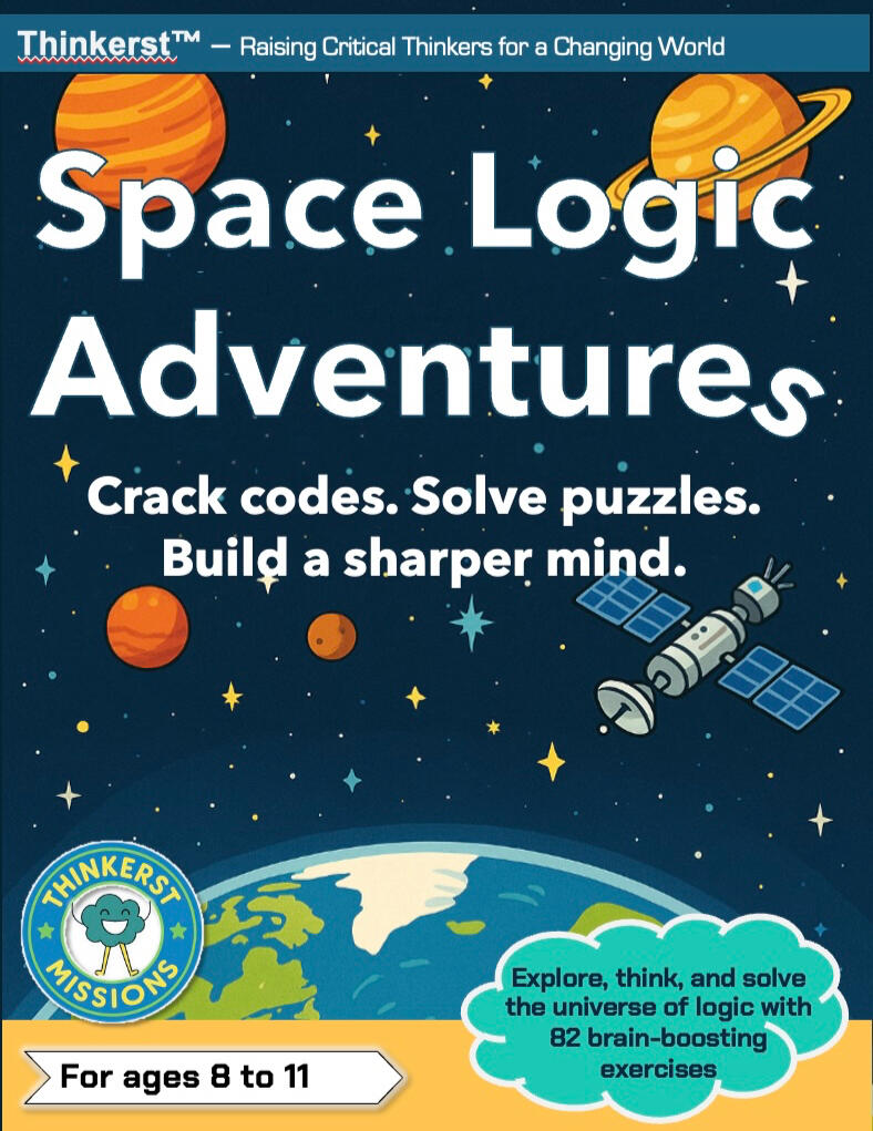 1. Space Logic Adventures - designed for kids 8 to 11 years old, this engaging, space-themed workbook develops logical and holistic thinking through fun, and real-world challenges. Kids will learn to link information, recognize patterns, and approach problems with a big-picture mindset - key skills for future problem-solvers.