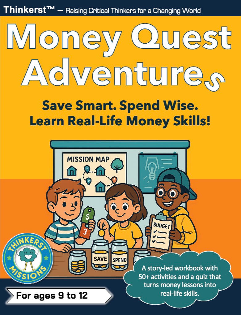 3. Money Quest Adventures – a fun, story-led money workbook for kids ages 9–12 that simulates real-life money decisions through eco-business adventures, smart budgeting missions, and ethical challenges. Unlike typical workbooks that just teach coins and counting, Money Quest Adventures puts kids in charge of running a planet-friendly business, making real-world choices about saving, spending, giving, and growing their impact. Through this interactive simulation, kids learn practical financial skills while building confidence, creativity, and a sense of purpose.